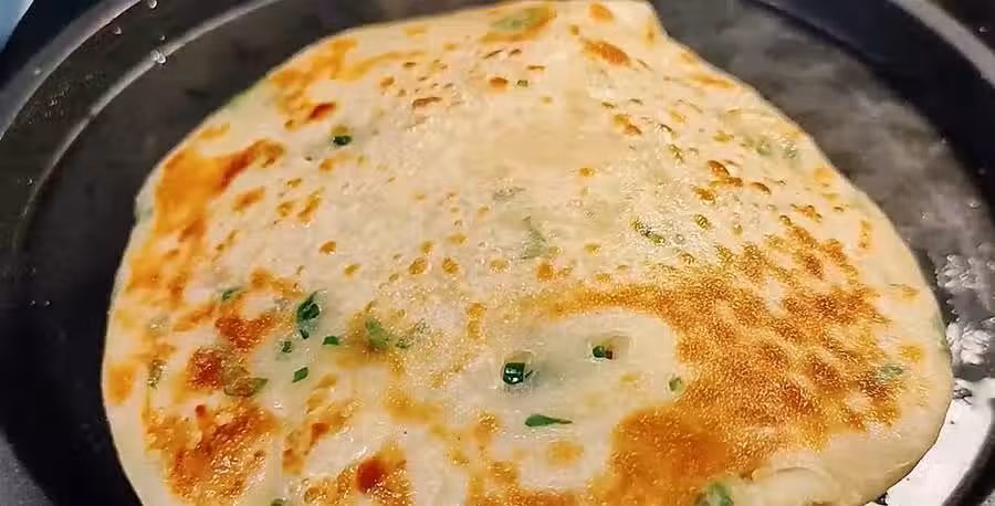 20.反復翻面多次,一直烙到兩面顏色金黃,餅面鼓起就可以出鍋了。