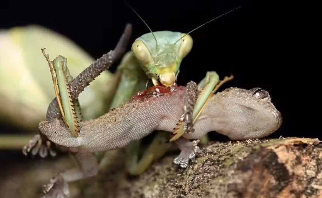 按照原有尺度,螳螂可謂是昆蟲獵手。甚至有螳螂捕食小型蜥蜴的鏡頭被拍到,它沒什麼腦子,沒有恐懼更沒有顧慮,一切都按本能來,抱上就啃。獅子變成螳螂的體型,它的相對優勢就消失了,獅子也就沒活路可逃了。