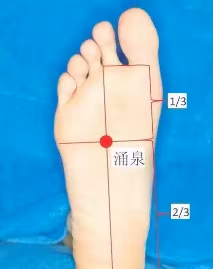 湧泉穴位置在足底的前1/3處(計算時不包括足趾),這個穴位比較敏感,不要用太大的力度,稍有感覺即可,以邊按邊揉為佳,持續5分鐘左右即可。