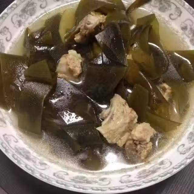 原料:豬排骨、海帶結,薑片、精鹽、黃酒。