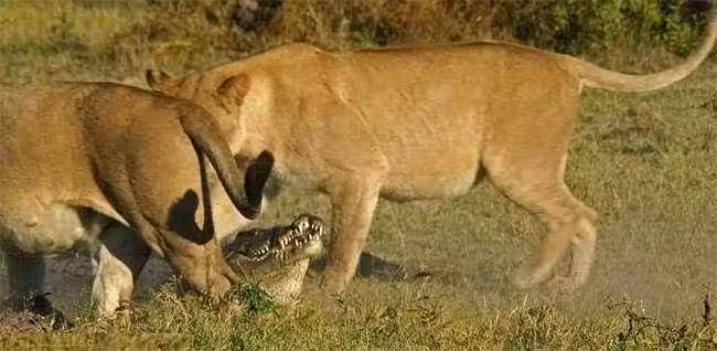 一隻鱷魚想要偷襲幼獅,遭獅群反擊,身體被掀翻成晚餐