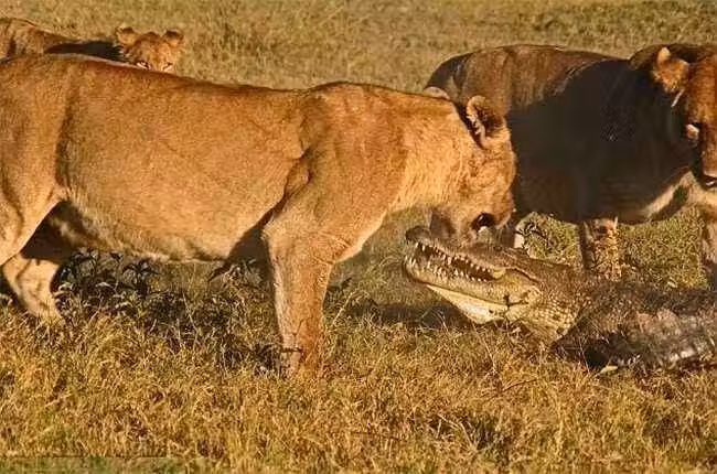 一隻鱷魚想要偷襲幼獅,遭獅群反擊,身體被掀翻成晚餐