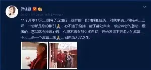 2017年12月7日,薛佳凝公開了自己皈依佛門的消息,她說自己每天早上八點鐘起來打坐,然後看書,讓心靈更靜逸,她喜歡並享受那樣的平淡和寂靜。
