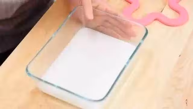 用杯子稱量,把有椰漿的白色部分分成三份,透明部分分成兩份。找一個玻璃飯盒,先倒入白色部分的第一份,放在冰箱冷藏5分鐘,基本上凝固了之後拿出來