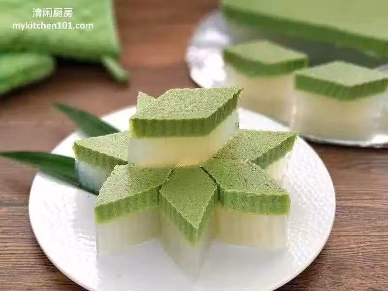 1 *香蘭汁: 把150毫升清水加入40克香蘭葉,攪拌至細膩,濾出150毫升香蘭汁。把蛋輕輕打散,然後把香蘭汁和蛋液加入椰奶拌勻。(溫馨提示:要成功的做出兩層的效果,建議採用從新鮮椰絲擠出的濃椰奶。市售合裝的濃椰奶(包括一些菜市場賣的新鮮椰奶)通常都有添加劑,造成油水不會分離,這樣就做不到兩層的效果了。)