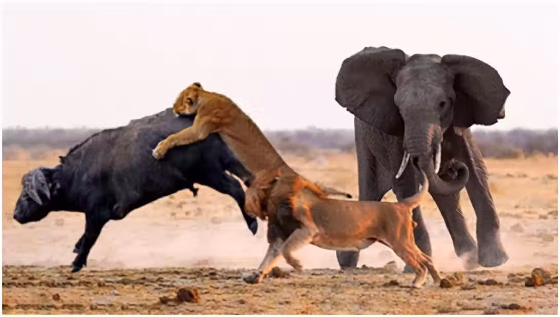 落單水牛被十幾頭獅子撕咬,下一秒卻被大象救下,獅子四處逃命