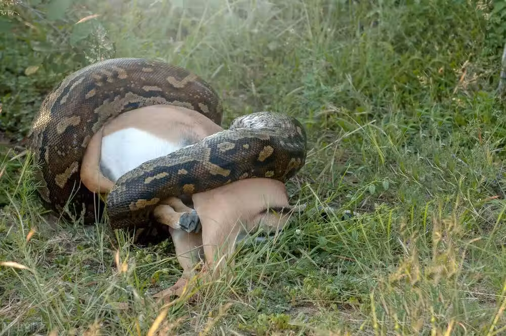 蟒蛇雖然無毒,但它們絞殺力量強大,成年蟒蛇體型可達5米以上,能夠絞殺中小型哺乳動物。因此,在蟒蛇體內發現整隻羚羊、整隻野豬和整隻豹子等體型較大的動物屍體也不足為奇。