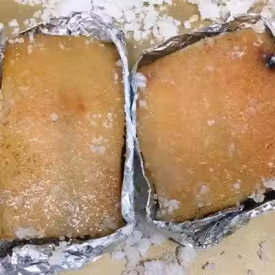 13、烤20分鐘左右把五花肉從烤箱中取出掃掉表面的粗鹽。
