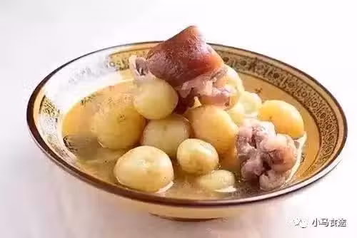 2.鍋入豬油燒熱,放入汆過水的臘豬蹄稍炒,再摻入鮮湯燉至臘豬蹄八分熟時,放入土豆,並調入少許鹽。待豬蹄燉至糯時,即可起鍋裝盤。