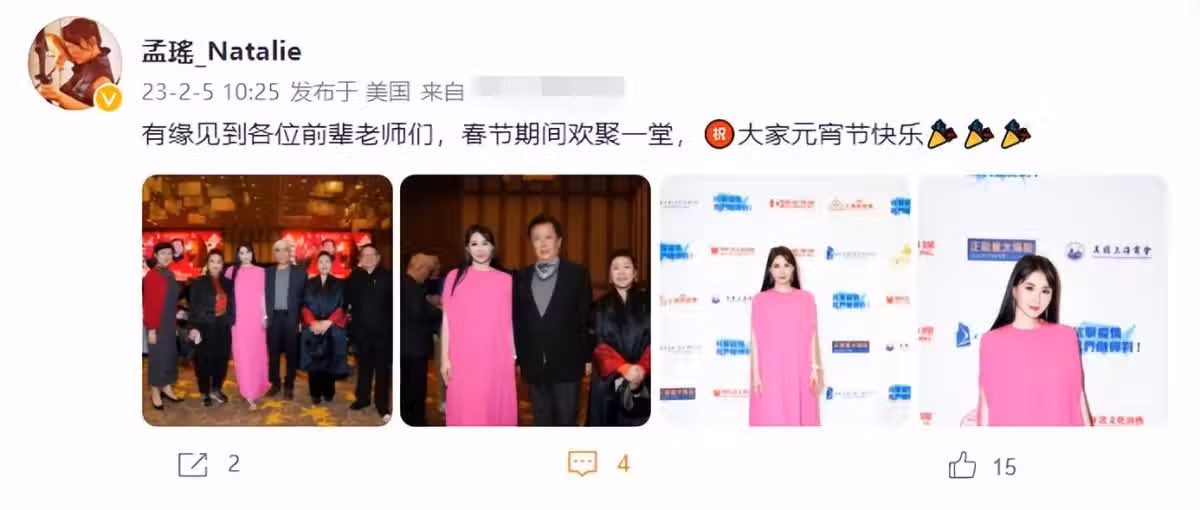 2月5日,39歲女星孟瑤在個人社交賬號上分享了一組出席宴會的照片,並配文稱,有緣見到各位前輩老師們,春節期間歡聚一堂,祝大家元宵節快樂。