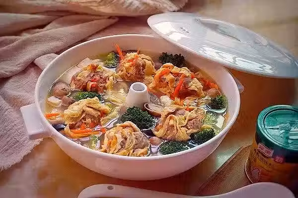 豬肉200g.胡蘿蔔1/2個.jpg">雞蛋2個.皮蛋1個.豆腐1塊.jpg">西蘭花1/2個.草菇100g、玉米豬骨濃湯600ml、鹽4g、薯粉20g、家樂雞粉調味料20g
