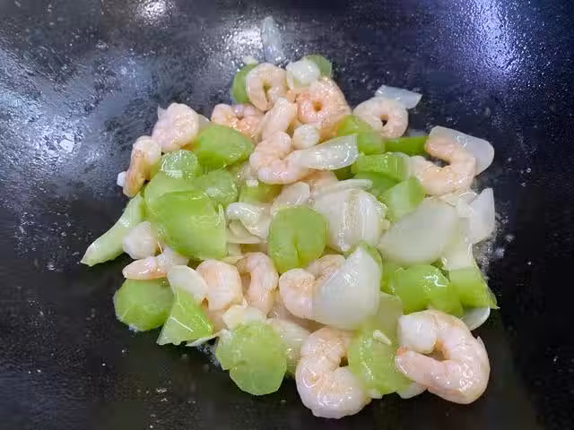 步驟4:接著加入西芹和百合,再加些鹽調味,翻炒均勻就可以出鍋了。