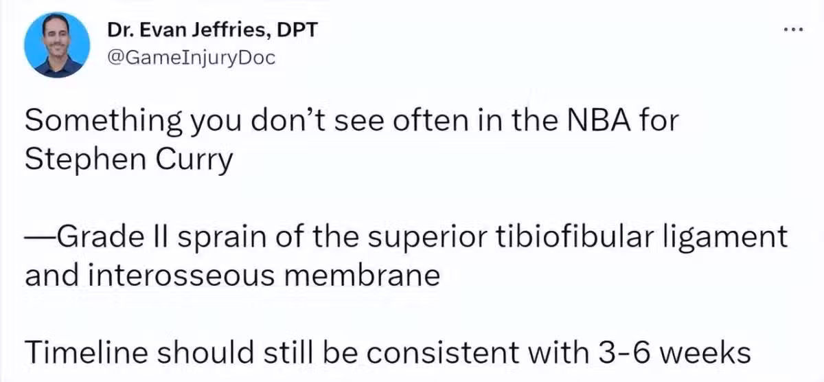 勇士官宣庫里傷情!韌帶撕裂+小腿挫傷預計缺席全明星3至6周