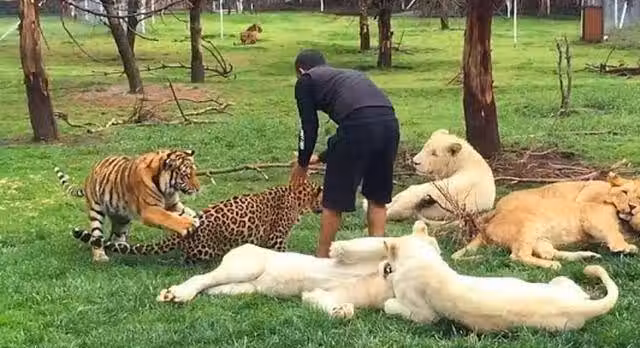 它們正倒在地上睡覺,畫面看上去非常溫馨,飼養員還特地蹲下身去撫摸其中的一頭白獅,不過身後的花豹會突然從遠處沖了過來,直接撲向了飼養員,還好老虎眼疾手快直接攔截了下來。