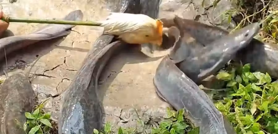 還有更奇葩的,小伙家裡養了一隻捕魚雞,將雞放入洞中後,魚兒們便一個勁的往外游,這下幾天的晚飯都不用愁了。