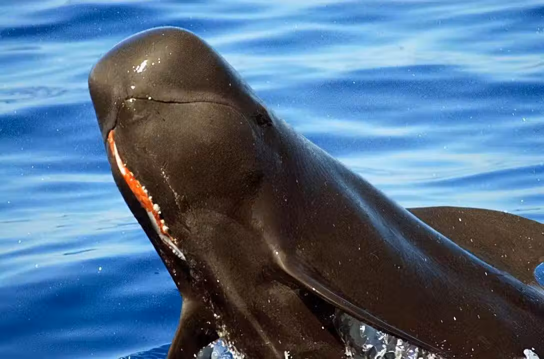 短肢領航鯨叼著大型魷魚的觸腕,從比例上看該魷魚個體很大很有可能就是大王魷,這條領航鯨不顧深潛的乏累躍出水面,看來心情不錯