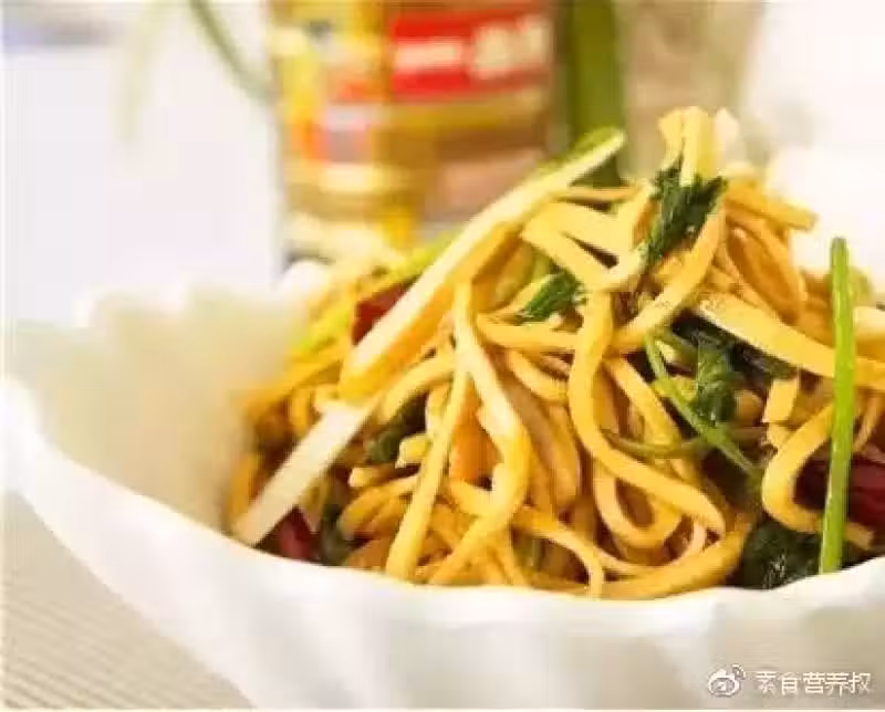 3、鍋燒熱油,放干辣椒炒香,放入豆腐皮絲,倒入醬油、蘑菇精、鹽,最後放入香菜爆炒均勻即可。