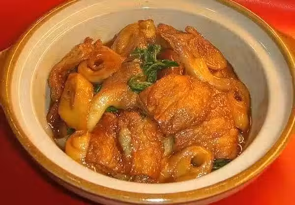 4、再入炸過的麵腸豆包鮮菇及醬油、水、冰糖、味醂燴煮約5分鐘。