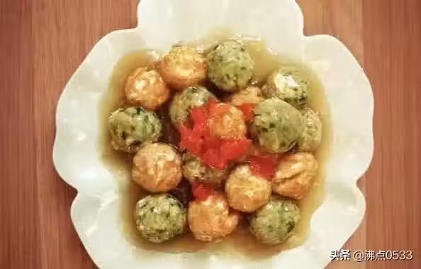 6、炒鍋熱少油,添水、生抽、勾芡,加入鹽、胡椒粉攪勻做成澆汁兒,澆在汆好的丸子上即可。