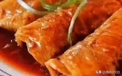 11、煮沸後,下煎好的豆腐皮肉卷,小火燜至湯汁濃稠,撒上蔥絲即成。