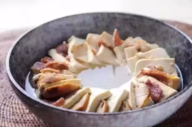 1.豆腐中間橫切,夾入素火腿,面上抹一層鹽,上鍋蒸熟3分鐘。