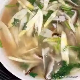 2、將竹筍、薑絲放在湯鍋中加適量清水煮15分鐘,再放香菇、金針煮5分鐘。放精鹽,味精即可。