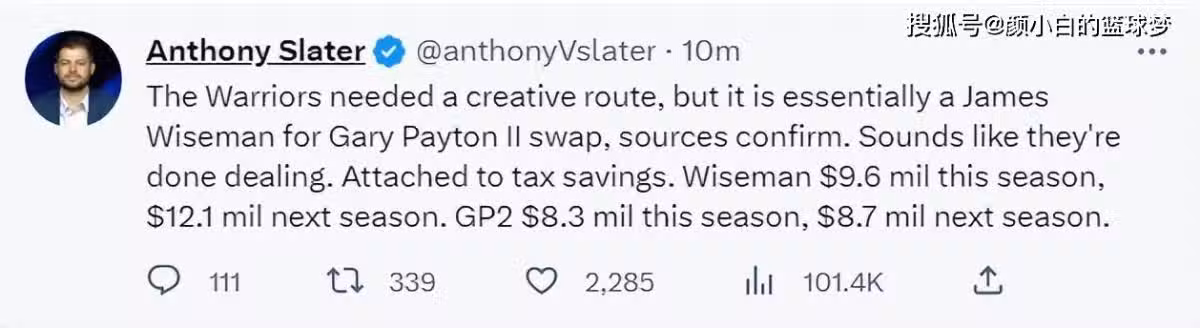 勇士隊記安東尼-斯萊德表示,勇士隊創造了一條新的路線,實際上是懷斯曼對佩頓的互換,勇士隊的交易也結束了,佩頓本賽季830萬美元,下賽季是870萬。