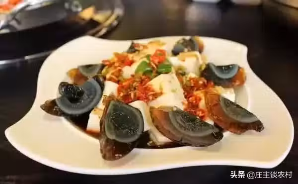 2.皮蛋去皮,切小丁倒在豆腐上。