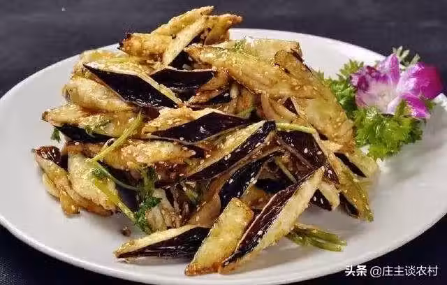 3.將蒸熟的茄子掛糊後入鍋煎透,出鍋改刀裝盤。