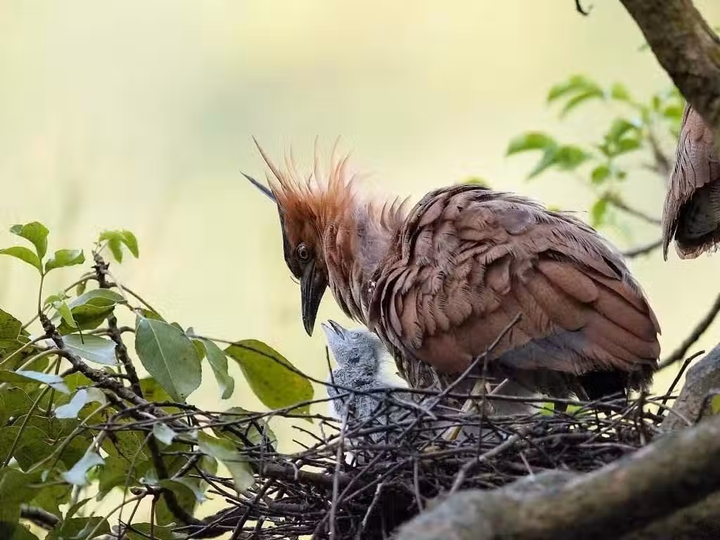 大約半個月後,小鳥就破殼了,黑冠麻鷺夫婦就會輪流出去捕捉食物來喂養雛鳥,有些時候也會出現父母兩只都飛出去的情況,雛鳥此時就會停止鳴叫,生怕有人注意到它們。在小麻鷺初步成長後,還會由鳥媽媽陪著在地上學步和覓食,而鳥爸爸就在一旁保護,一旦有人靠近馬上就會豎起羽毛,張口發出怪叫來嚇退敵人。