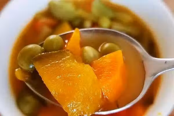 6. 水開加青豆,南瓜和黃瓜,繼續煮半個小時就可以了