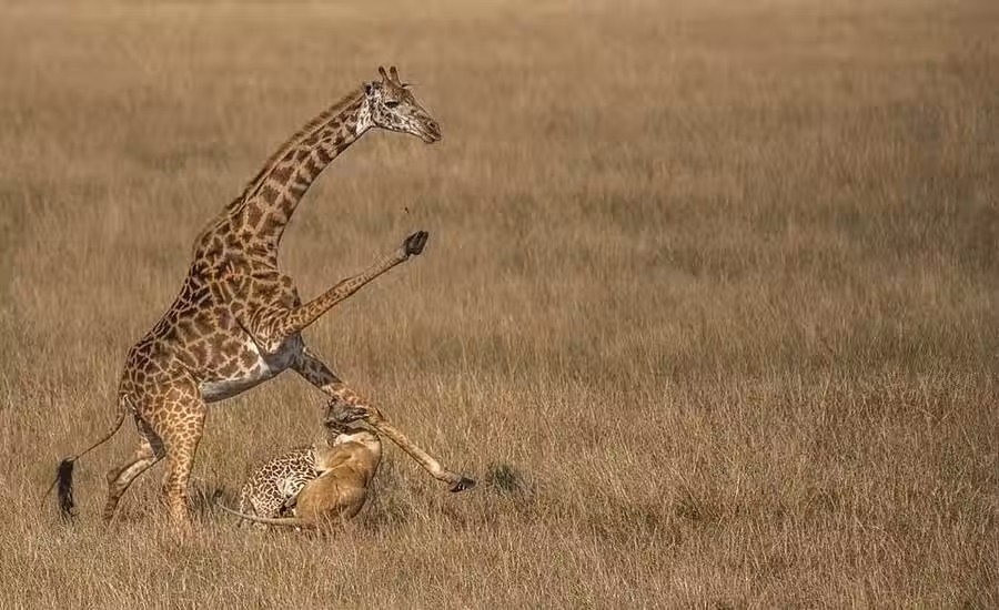 當非洲獅盯上長頸鹿母子,鹿媽媽保護幼崽兇猛反擊,不料獅子眼中只有小鹿