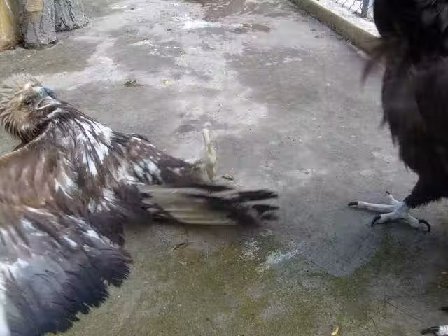 禿鷲金雕「誤放同一籠中」,金雕被撲倒「瘋狂撕咬」,趴在地上成這模樣:雕兄太慘了!
