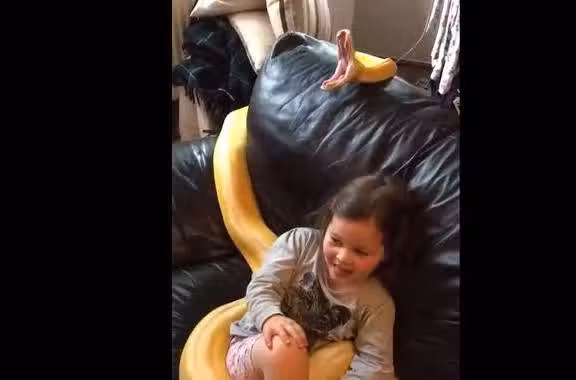 可能是電視劇到了精彩的部分,也可能是到了搞笑的橋段,小女孩露出了開心的笑容。小女孩沒有注意到的是,就在她笑得很開心的時候懷里抱著的蛇靠在搭在沙發靠背上的蛇頭突然張開了大嘴。