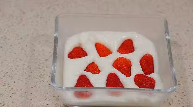 3、 碗中鋪上些許椰蓉,把熬煮好奶糕倒進碗中,上面鋪一層草莓,繼續倒入奶糕,最上方再鋪一層椰蓉,用保鮮膜蓋好放入冰箱冷藏。