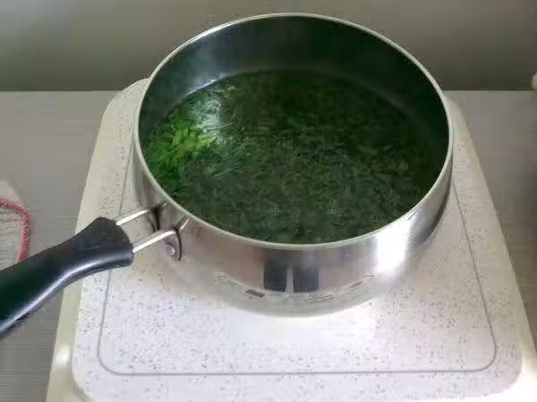 2、鍋里燒開水。水煮開後倒入艾葉煮開。