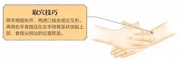 方法:按壓右手列缺穴時,使右手放鬆,一邊吐氣一邊用左手的大拇指用力按壓6秒鐘;如果是左手,則使左手放鬆,用右手的大拇指強力按壓;按摩時以酸脹感為好。