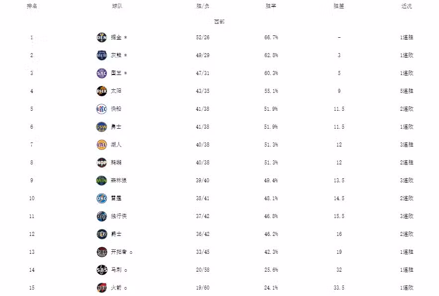 勇士的戰績為41勝38負,同樣都是38負的還有快船、鵜鶘、湖人,在太陽排名比較穩定、森林狼連敗的情況下,很大機率第5和第6名的兩個直通季後賽的席位,會在勇士快船、鵜鶘、湖人中間產生,而他們之間的差距只有0.5個勝場,可以說微乎其微。