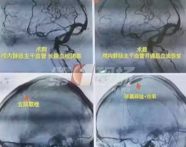 情況緊急,醫院立刻召開專家會診,為其進行手術。在手術過程中,可以看到腦部血管的前1/2已完全堵塞,醫生也準確將血栓取出。手術後,王某住院19天才出院,後續還要進行長達半年的藥物治療。