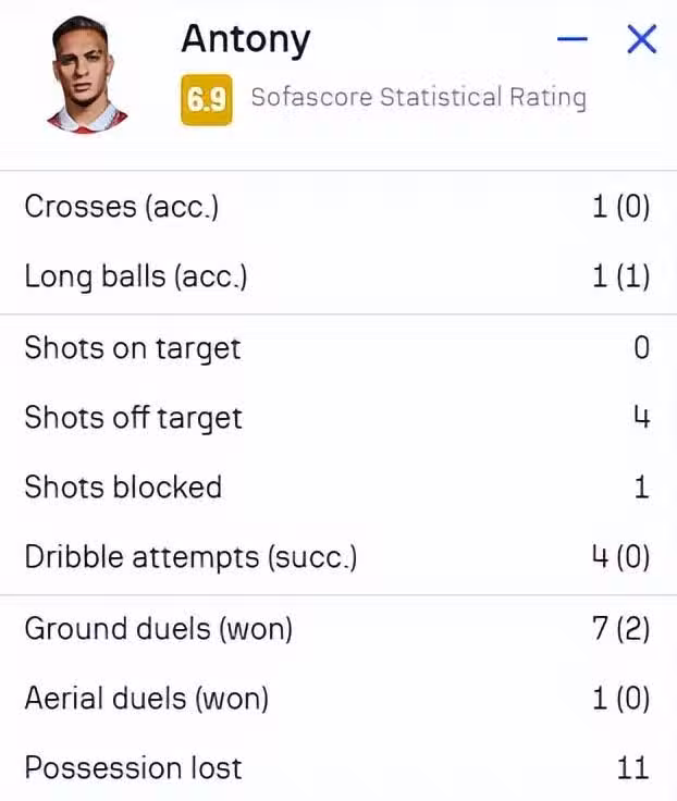 除此之外,安東尼本場4次嘗試過人全部失敗,7次地面對抗僅有2次成功,空中對抗全部失敗,也沒有送出成功傳中,共計11次丟失球權。曼聯的幾次反擊機會,也因為安東尼的傳球不到位和失誤而被延緩、浪費。這位「億元先生」是曼聯當之無愧的球權黑洞和進攻終結者,憑一己之力毀掉了復仇之戰的大勝。