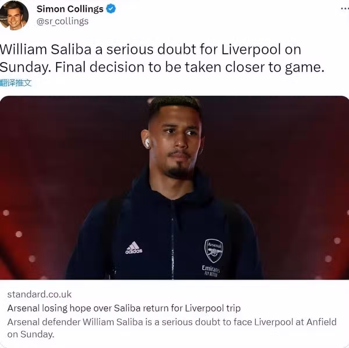 倫敦晚旗報記者SC發文表示,薩利巴出戰對利物浦比賽的可能性進入了巨大疑問,目前阿森納仍然對這名中衛的復出日期含糊不清。