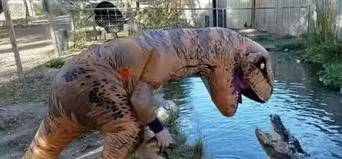 老外穿上恐龍服裝,襲擊水池中的鱷魚,「鱷魚的行為」把人看懵了