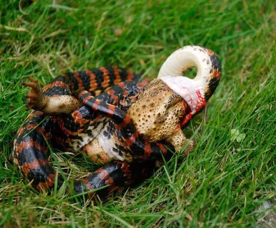 而赤鏈蛇,對於這只到嘴的癩蛤蟆哪裡肯輕易放過,一邊繼續含住癩蛤蟆的頭部,然後在用身體將癩蛤蟆纏繞住,防止它跑掉。