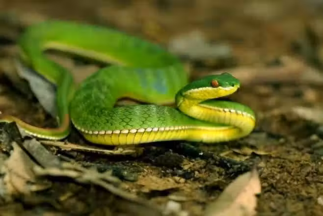 墨脫竹葉青蛇:它的 體側一般有一條紅白參半的縱紋,頭比較大,呈三角形,頭頂有細小鱗片,通體為翠綠色。目前僅知道的分布在模式標本產地西藏聶拉木具卻克蘇木。