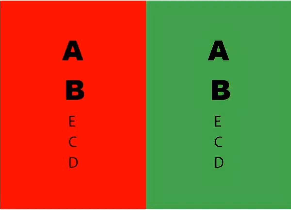 裸眼觀察圖片,如果紅色清晰的話很可能是近視,綠色清晰則可能是老花眼, 兩邊一樣清晰則說明視力正常。