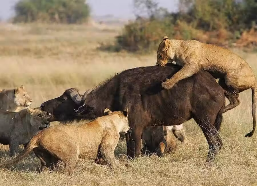 影響獅子狩獵成功的環境因素包括草地/灌木覆蓋、時間、月亮的出現與地形。研究發現,獅子偏好的獵物體重在190——550kg,最為偏好的獵物體重為350kg,明顯偏好的平均290kg,劍羚、水牛、角馬、斑馬等大中型獵物是獅子偏好的,超出偏好范圍一般避開,比起狒狒,獅子還是更喜歡更適宜更擅長捕殺水牛角馬等,狒狒只是獅子偶爾的開胃小菜、新奇玩意罷了。