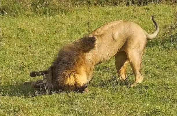 雄獅鎖喉鬣狗一招制敵,把鬣狗翻來覆去調戲,怕他裝死臨走再來一口