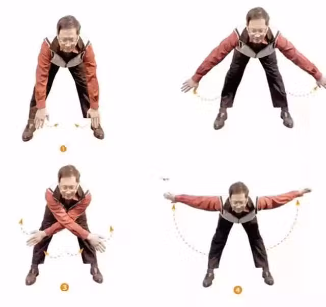 雙臂自然下垂,在體前做左右擺動的交叉甩手運動。幅度逐漸加大,連續做20~30次。