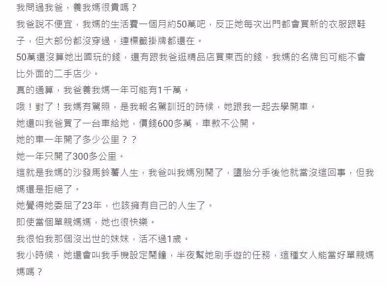 其他網友網友也紛紛勸:「你媽做事一頭熱耶!」、「建議爸爸放手, 該拿回來的拿一拿。」、「 請律師訴請侵害配偶權離婚,最好連小王一起告。」、「公主要吃苦才會長大,就讓她出去鍛鍊一下。」、「爸爸人太好了吧!」、「沒錢就會後悔了,花錢大手大腳的人回不去的。」