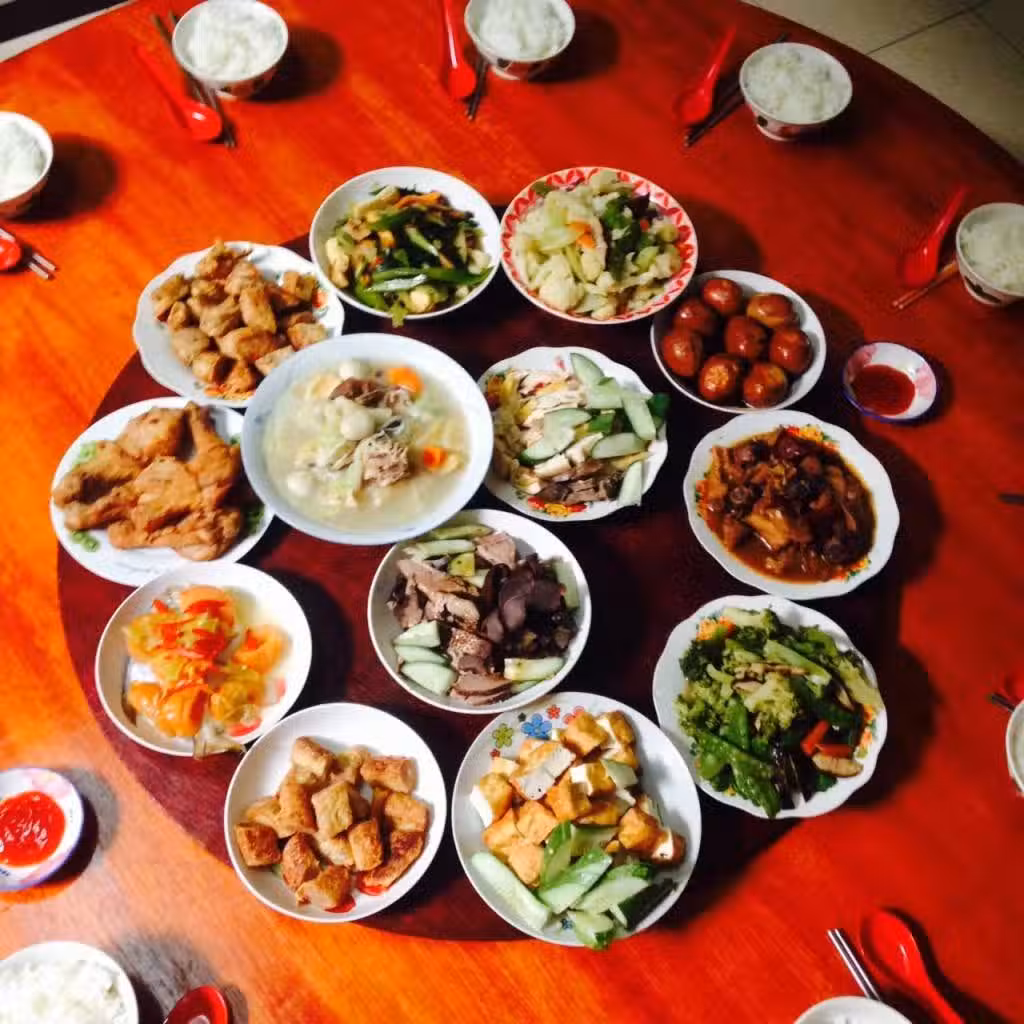 我跟婆婆買完菜回家,在廚房裡忙活了一個早上才做好一桌子菜。